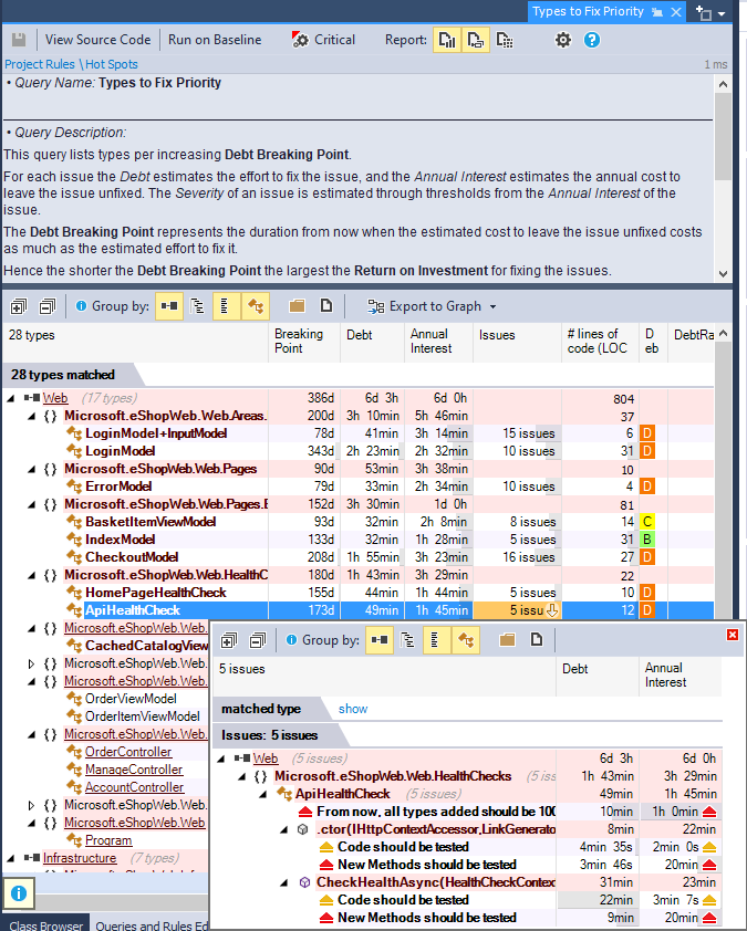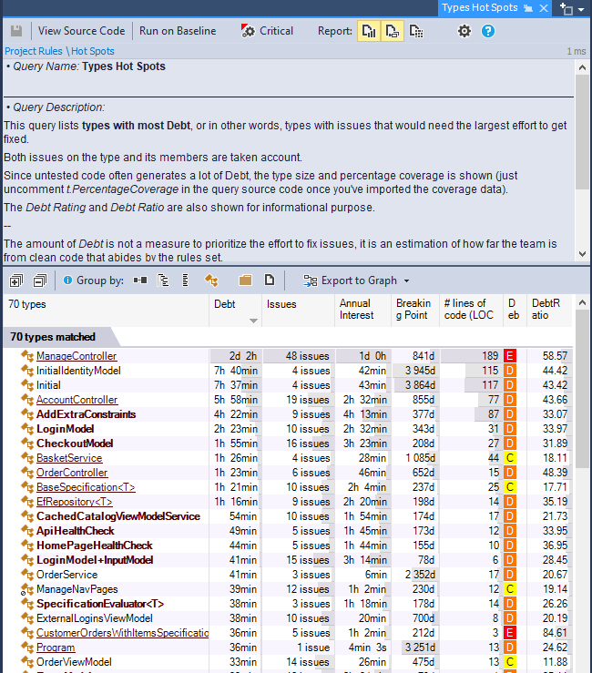 In the dashboard menus shown on the screenshot above we can also see the menu Types Hot Spots. Similarly to Types to Fix Priority this menu lists all types, but ordered with highest cost-to-fix first. Hot-spots shouldn't necessarily be fixed first. But knowing where hot-spots are and quantifying them is a useful knowledge. This can help convincing the management to get the resources to refactor some rotten code that annoys everyone in the team for a while.