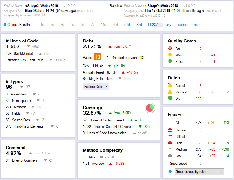 The CppDepend dashboard shows the delta for each value presented, and also a up/down better/worst indicator. As any value on the dashboard, any delta value can be clicked. A LINQ query is then generated to dig into the delta. For example such generated query lists new issues, new classes or methods newly covered by tests.