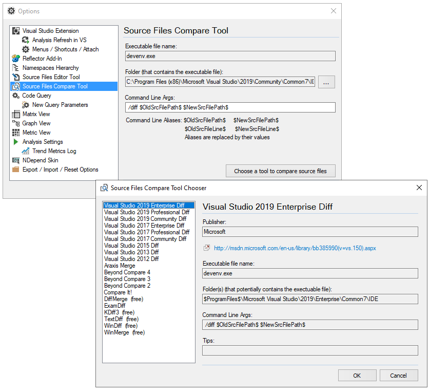 Per default the Visual Studio file diff feature is used to diff sources, but you can plug your preferred diff tool through Options > Source File Compare Tool.